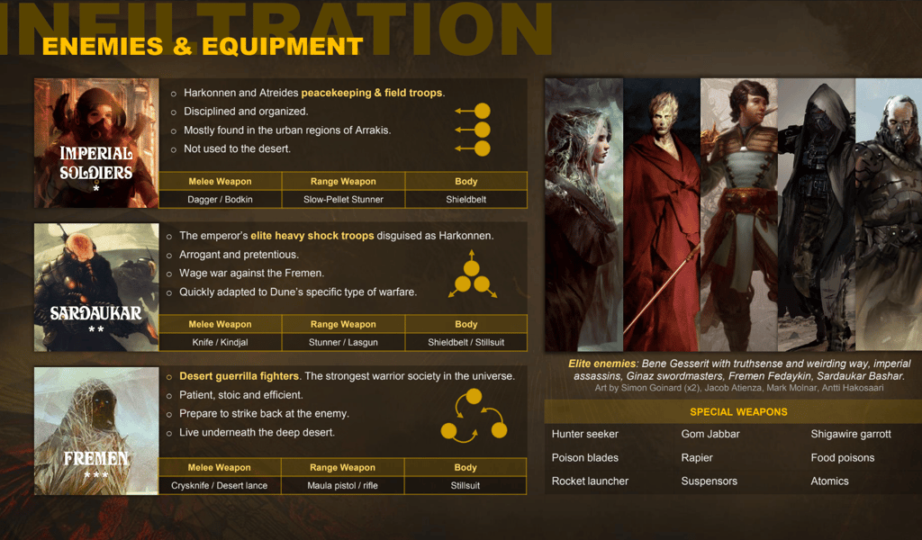 STORY: For the sake of player agency, the game follows Lena, a cousin to Paul Atreides, a niece of Jessica born in secret by the Bene Gesserit. Her story unfolds parallel to that of Paul, happening in the shadows of Arakis and Giede Prime, exploring the plots of the Kwisatz Haderach, the Breeding Program, and the Fremen Uprising from a new point of view, while night visions keep us up to date with the story of Paul. All of it is part of the Golden Path.