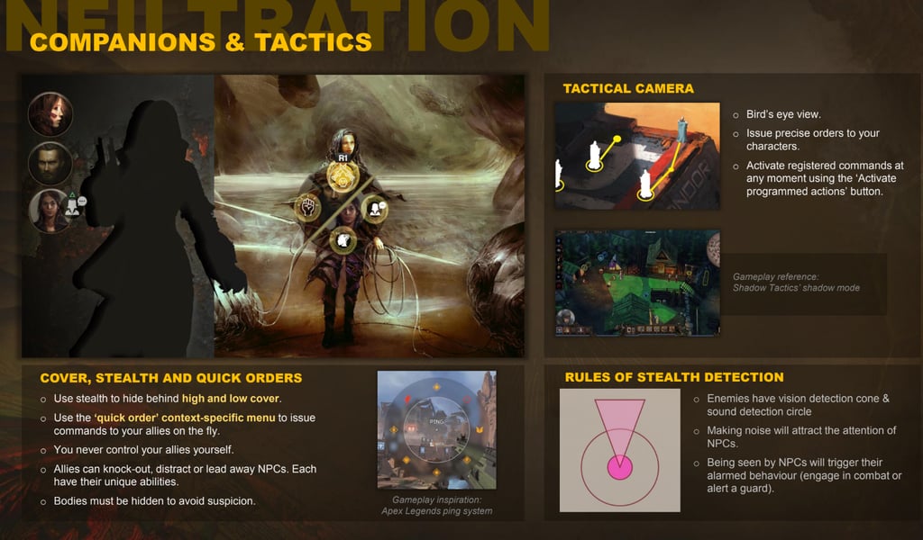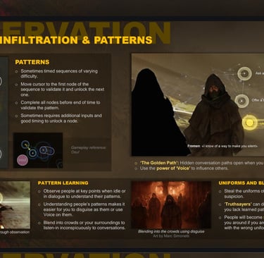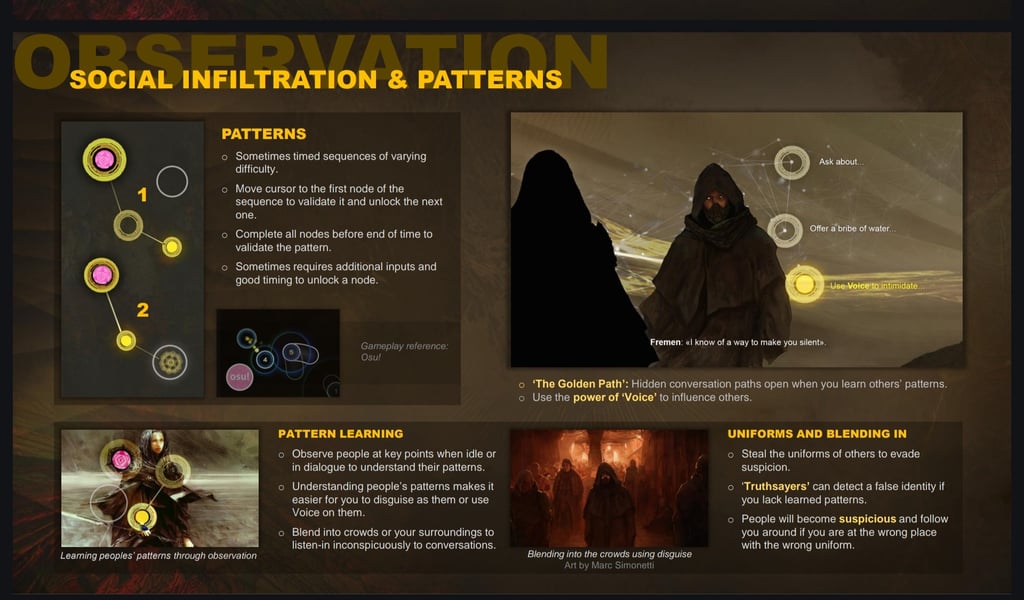 GAMEPLAY: The game takes inspiration from Hitman III, with an emphasis on social infiltration, acquiring costumes, mimicking subtle language patterns, and using Bene Gesserit powers in dialog and in combat, with a rhythm-game-like way of playing combat, simulating the feel of high level fencing and in-depth knowledge of tactics and anatomy. Companions enhance the tactical feel of the game and enrich the story.